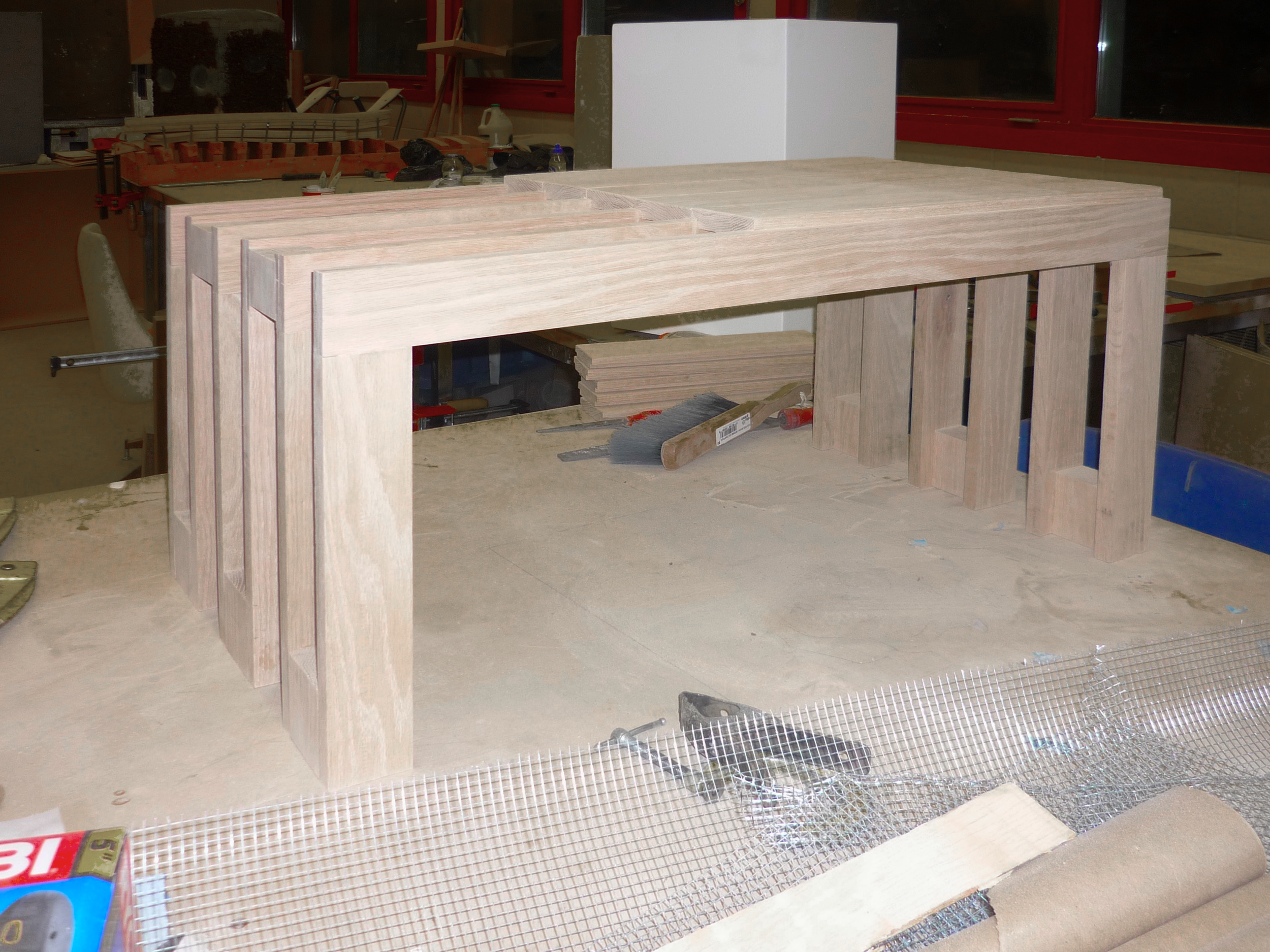 The finalised form is a six-legged table made of 41 separate solid wood pieces, connected by tongue-and-groove joints and glue. It has five removable slats of the same shape and size. These slats are interchangeable and slide into grooves on the upper side of the table. The rest of the table top surface consists of the same type of slats, but glued in place so they are not removable.