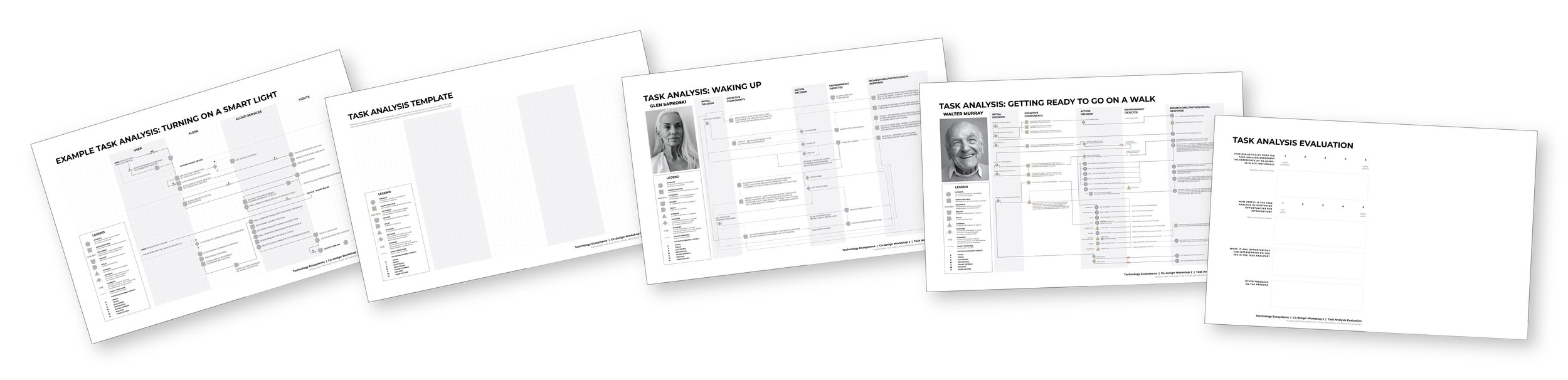 We introduced participants to the concept of task analysis diagramming. The method takes what might seem like a single action, such as turning on a smart light, a breaks it down into discrete micro-actions and interactions between the user and the objects/environments/other people involved in the task.